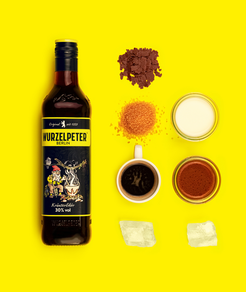 Etwas aufgebrühten Espresso auf einen Teller geben. Ein Longdrinkglas kopfüber hineinstellen und den benetzten Glasrand mit Rohrzucker bestreuen (ggf. karamellisieren). Anschließend WURZELPETER BERLIN, Kaffeelikör und Espresso mit Eiswürfeln shaken und in das Glas mit Eiswürfeln seihen. Die Sahne steif schlagen und auf den Cocktail geben. Mit Tonkabohnen- oder Muskatnussabrieb garnieren und eiskalt genießen!